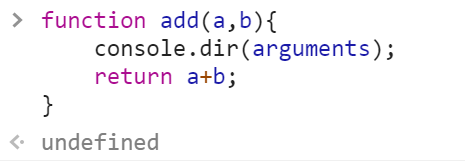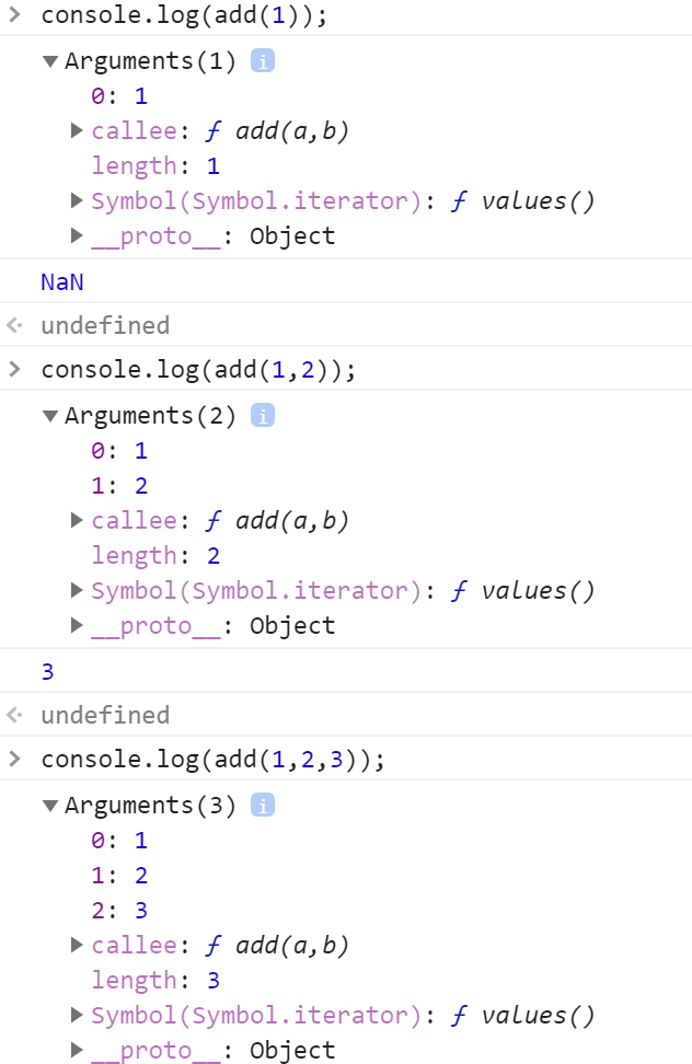 구체적으로 살펴보기 위해 아래처럼 add함수에 arguments객체를 찍어보면,