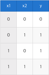 먼저 OR진리표를 그래프로 나타낸 것이다. OR그래프는 0과 1을 분리하기 위해서 1차식으로 나타낼 수 있다. AND와 NAND논리회로 역시 1차식으로 나타낼 수 있다. 직접 그려보기 바란다.