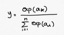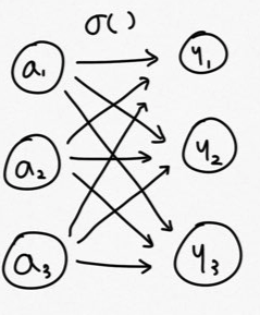 소프트맥수 함수의 분자는 입력 신호 ak의 지수함수, 분모는 모든 입력 신호의 지수 함수의 합으로 구성된다. 소프트맥스 함수를 그림으로 나타내면 다음과 같은데, 소프트맥스의 출력은 모든 입력 신호로부터 화살표를 받는다. 식의 분모에서 보듯, 출력층은 모든 입력 신호에서 영향을 받기 때문이다.