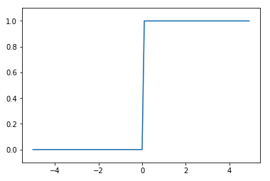 계단 함수는 임계값 이전에는 출력값이 0이 었다가 임계값을 넘으면 1이 되는 함수이다. 계단 함수를 구현한 식은 아래와 같다. 여기서 임계값은 0이다.