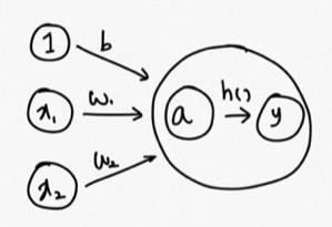x1,x2는 입력신호, w1,w2는 가중치, b는 편향이다. 이 3가지를 네트워크로 나타내보자.