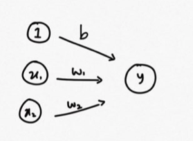 익숙한 그림이지만 편향이 추가됐다. 이 그림은 위 퍼셉트론 식을 1*b + w1*x1 + w2*x2라고 풀어서 나타낸 것이다.